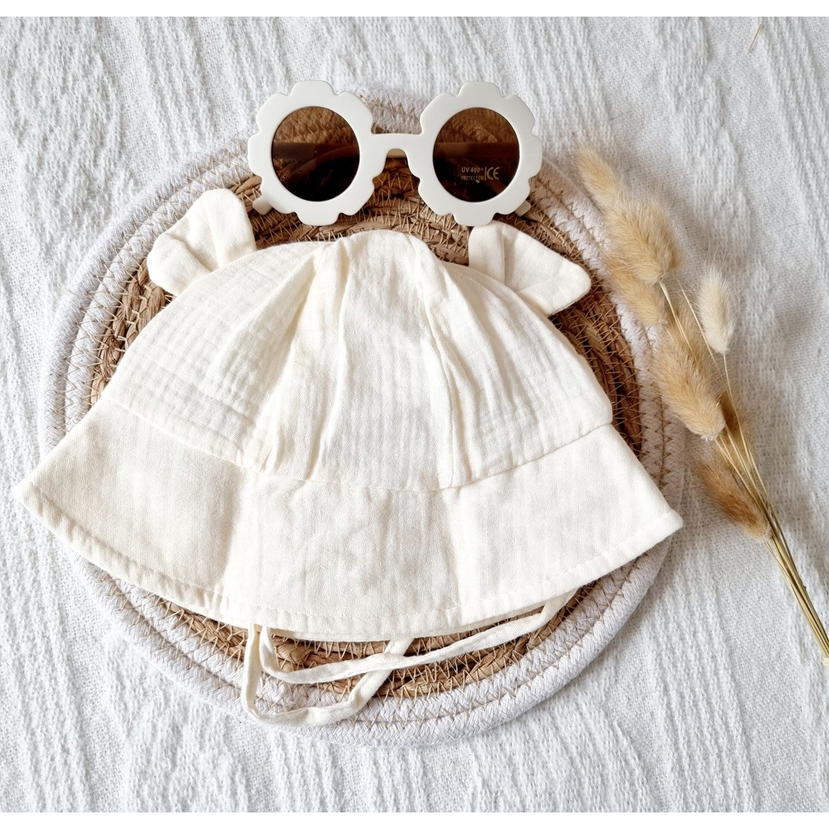 Heel schattig zacht zomerhoedje met bandje voor onder de kin.