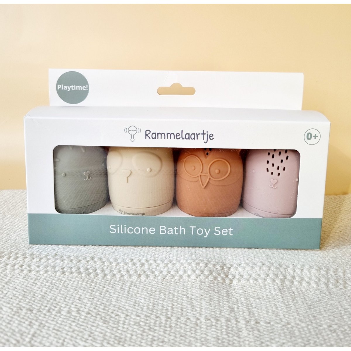 Set van 4 siliconen badspeeltjes Spetteren, spatteren en spelen maar! Deze superschattige badspeeltjes fungeren als gietertjes. Ze zijn gemakkelijk open te maken om ze schoon te maken, zodat er geen schimmel in de speeltjes kan komen. Ze hebben de vormen panda, tijger, konijn en uil.